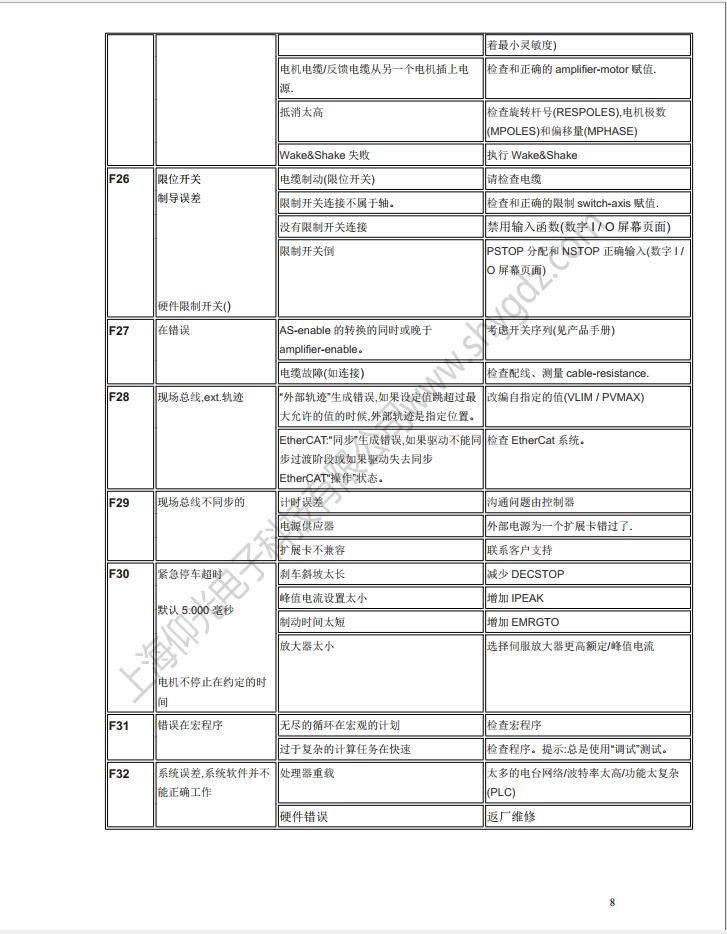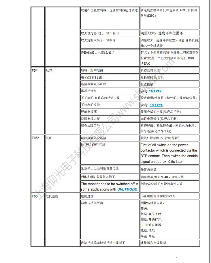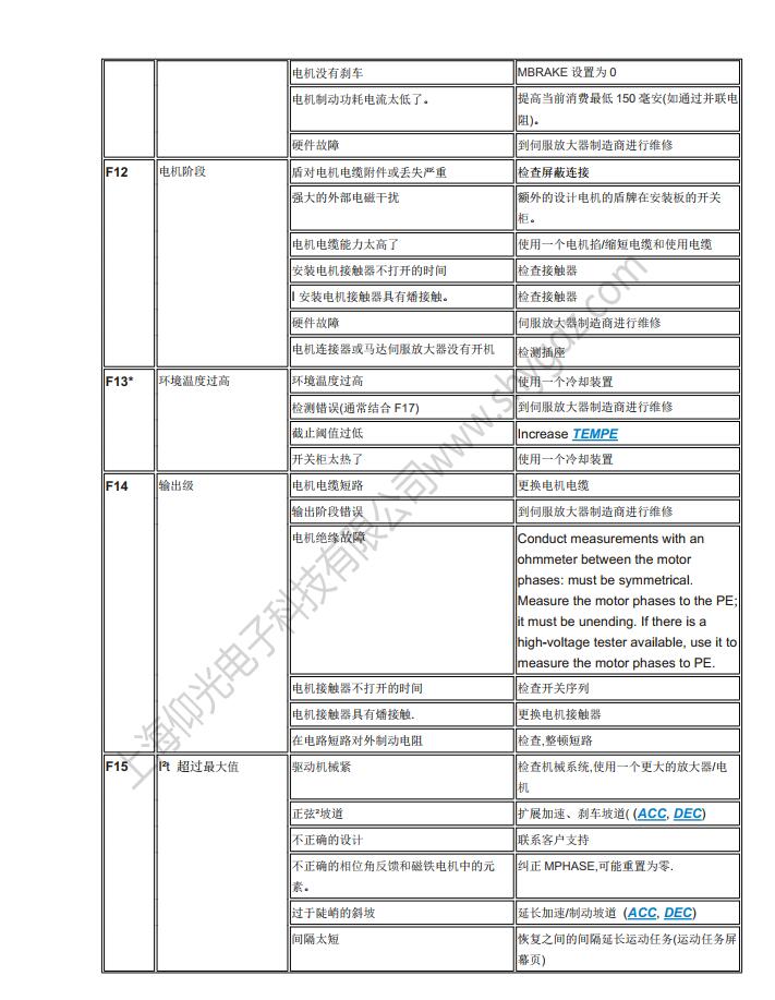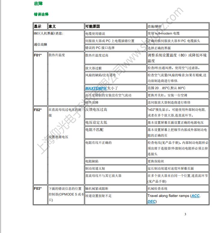 科爾摩根S62000維修,S64001,S67001,S60100,S60300,S60600,S61000,S61400,S30363,S30661,S31061,S30301,S30601,S30101維修、CR03550維修、科爾摩根伺服器常見的故障有:F02、F01、F04、F06、F09、F15、F19、F25、無顯示等;KOLLMORGEN科爾摩根伺服常見故障現象:上電報過電流故障、過電壓、地短路故障、欠電壓、電壓缺相、外部報警、散熱片過熱、外部報警、變頻器內過熱、制動電阻過熱、變頻器過載、DC熔斷器斷路、存儲器異常、鍵盤面板通信異常。科爾摩根伺服驅動器故障顯示警告顯示及解決辦法一覽表: