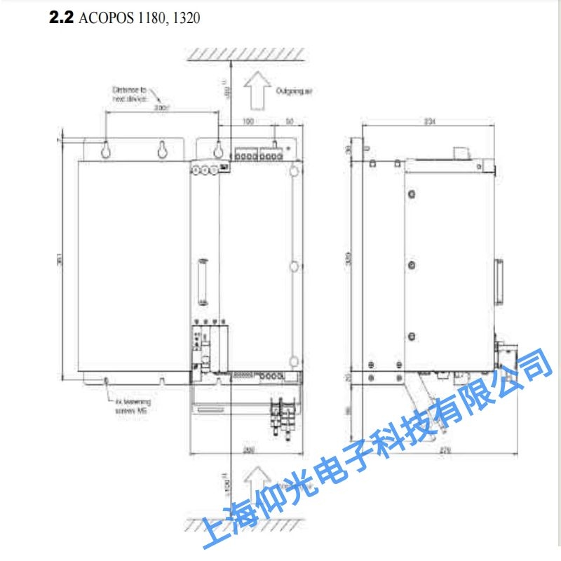 貝加萊ACOPOS1180/ACOPOS1320驅動器安裝要求-為了保證良好的空氣循環(huán) ACOPOS 伺服驅動的上下方必須各留至少 80mm空間 為了避免電纜問題在 ACOPOS 伺服驅動下方至少留出 100mm空間.