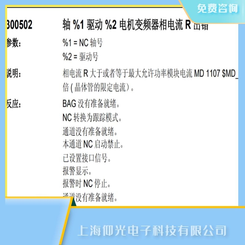 上海仰光電子科技有限公司維修面向全國,提供免費檢測,免費咨詢,有測試平臺,同一故障六個月質保,修不好不收費用,如有任何故障可隨時聯(lián)系我們,工程部溫馨提示:如果設備出現(xiàn)報警或者損壞,不是專業(yè)技術人員請勿私自拆卸,以防帶來安全隱患以及給設備造成二次傷害.上海仰光電子-您身邊的設備維修維護專員.關于常州西門子SIEMENS840c數(shù)控系統(tǒng)維修,西門子報300502故障報警代碼維修的技術問題上海仰光電子提供24小時免費咨詢服務.