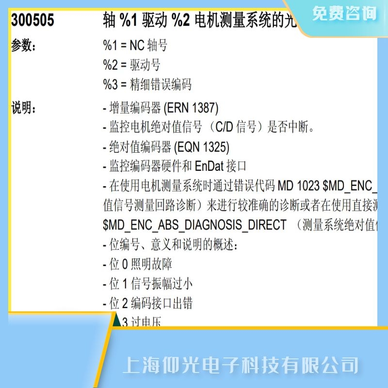 上海仰光電子科技有限公司是一家專業從事840c西門子數控系統維修,工業自動化產品維修、銷售、系統集成的綜合服務類公司,年維修西門子工控產品(伺服電機,伺服控制器,變頻器,伺服放大器,直流調速器,觸摸屏,PLC,軟啟器,數控系統)約8000余臺,整體修復率高達98%以上。全套測試平臺,軟硬件結合,帶載運行,維修速度快,價格低,免費檢測,修好測試后發出,24小時聯系熱線 -13817011982.關于江陰SIEMENS西門子840c數控系統維修,300505光學編碼器出錯維修的技術問題上海仰光電子提供24小時免費咨詢服務.